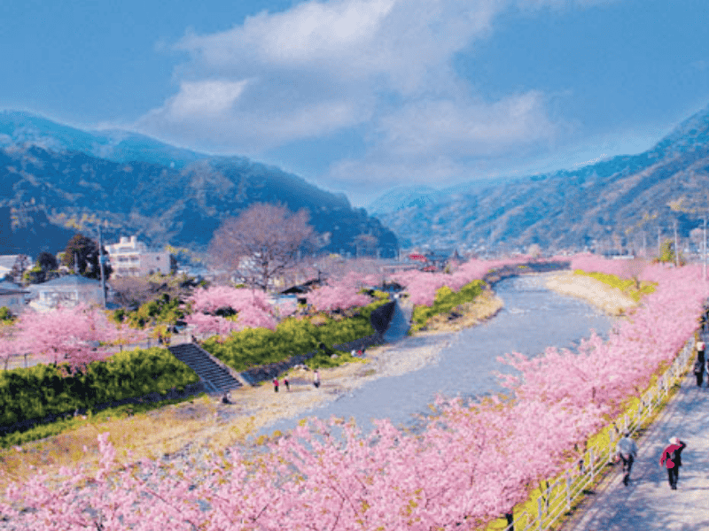 • 粉色櫻花隧道: 河津川沿岸種植了超過 8,000 棵櫻花樹,形成長約 4 公里的櫻花隧道。